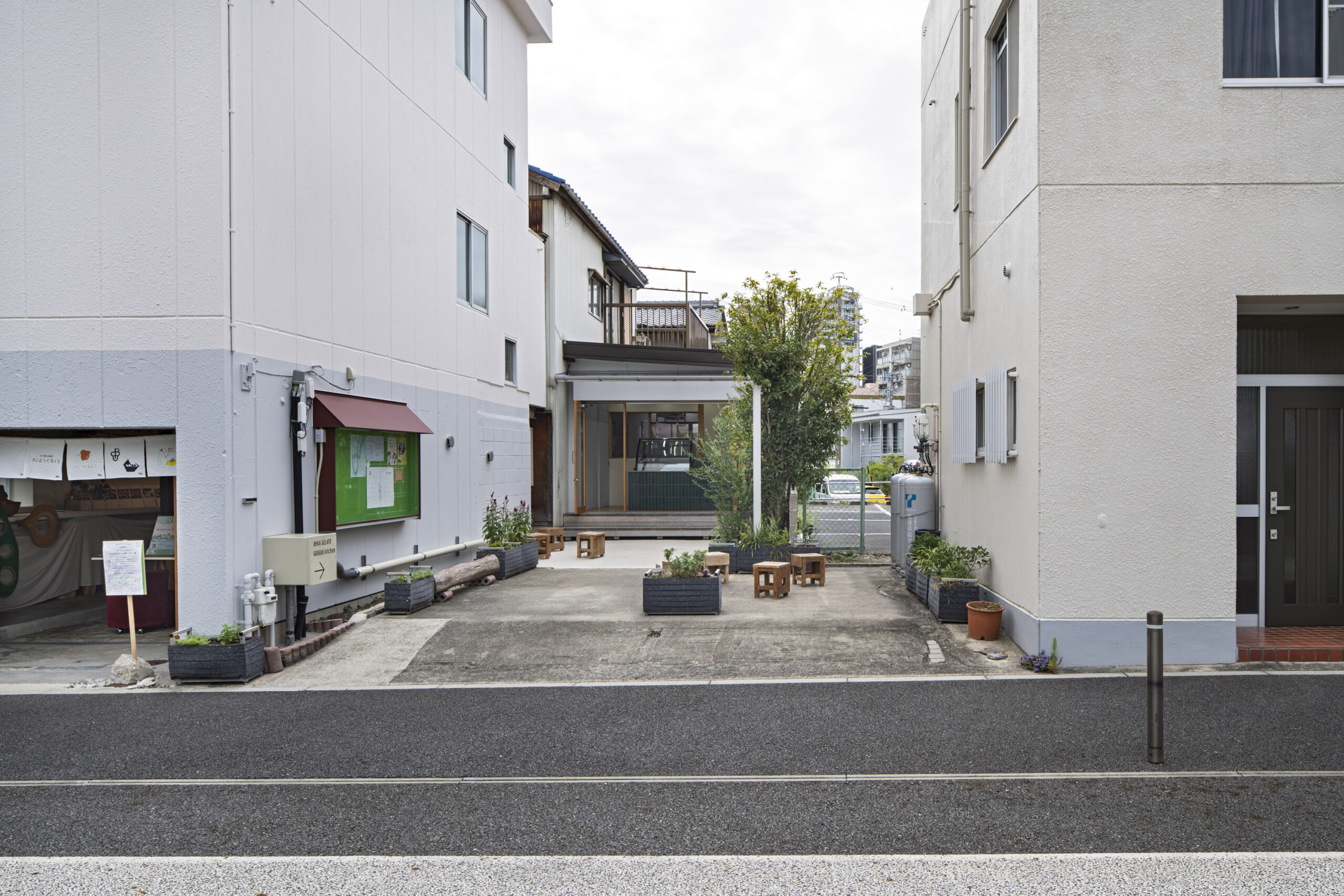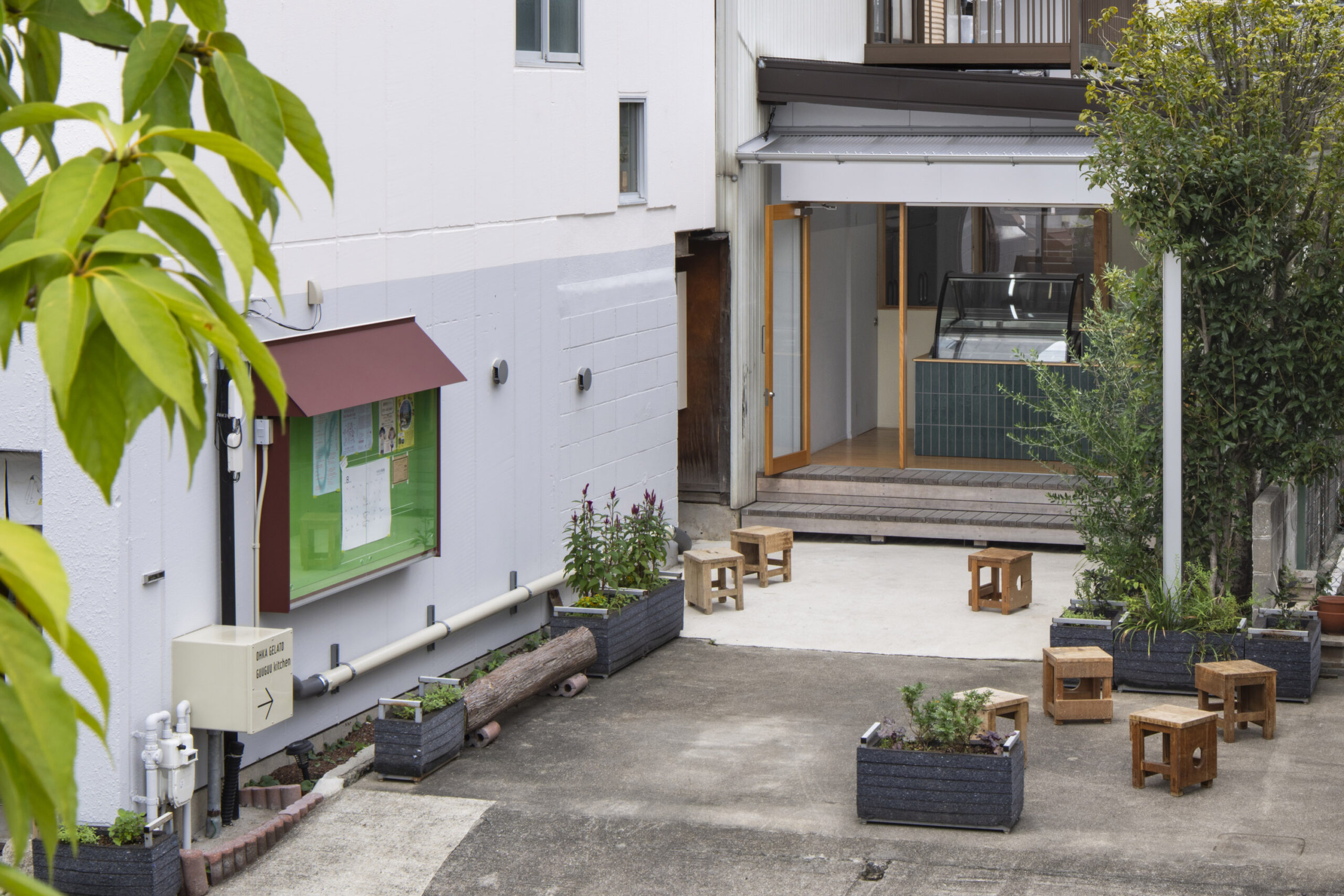 店舗自体は奥まった場所にあるが、奥まっているが故に生まれた屋外スペース(本来は駐車場としてあった場所を共有スペースとして開放)を客席として活用することで、公園に面した小さな店舗として佇み、目の前の中央緑道へと人の活動が広がっていくことを期待する。