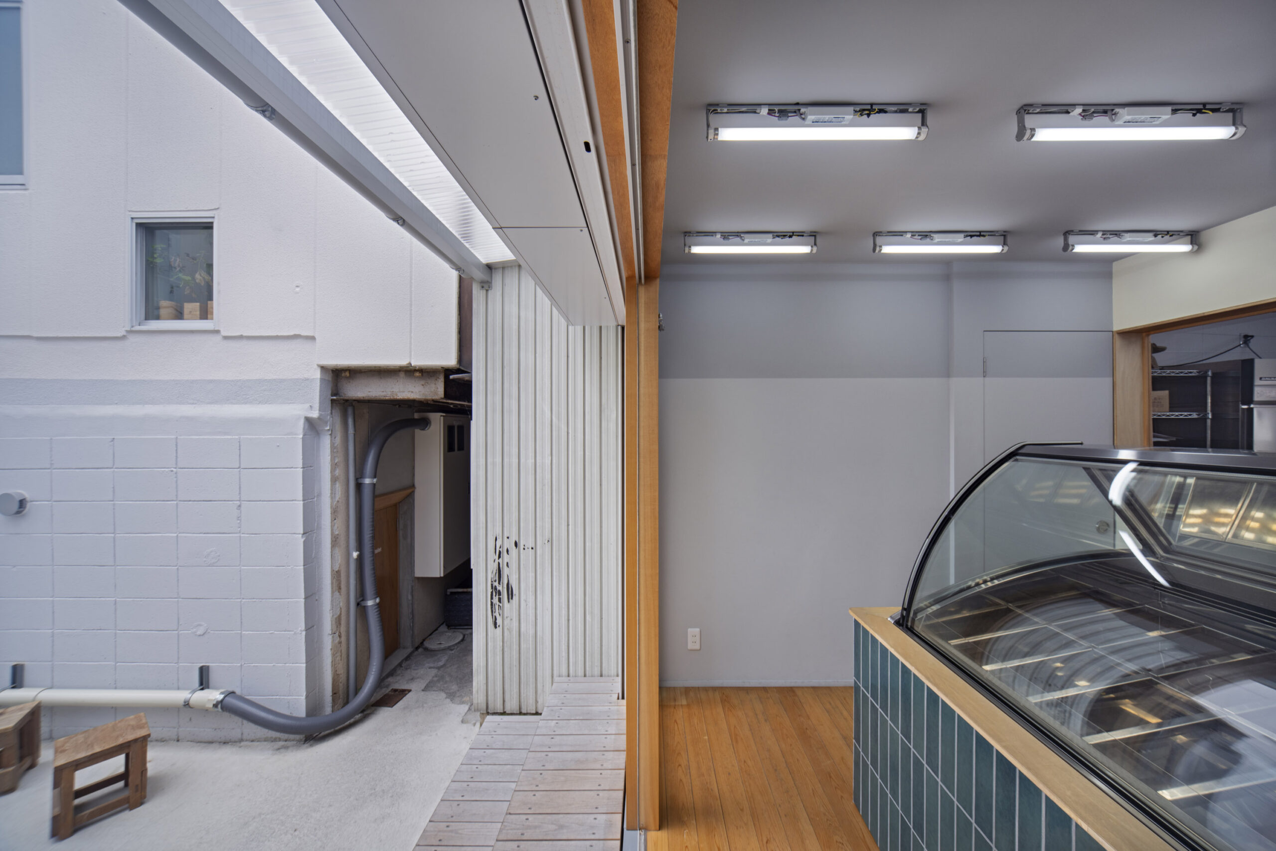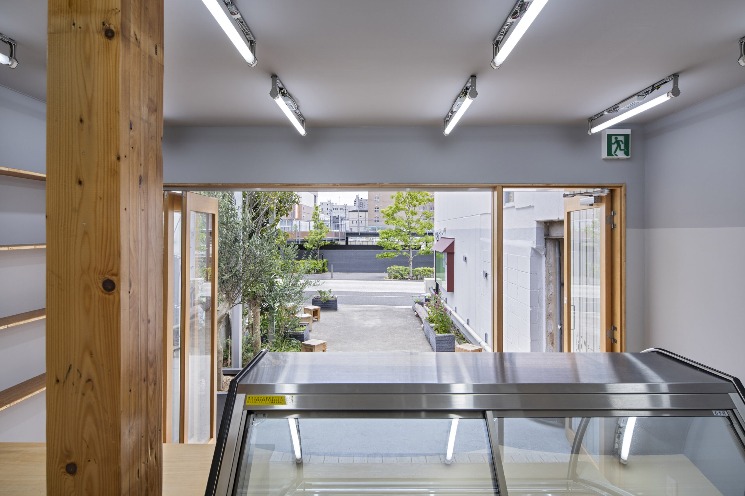 また、販売スペースを最小限(ショーケースとレジ、従業員2名がサービスできるスペースのみ)とし、店舗奥にある製造スペースまでお客さんが行けるようにした。窓越しでジェラートを製造している様子が見られるようになり、単にジェラートを販売する場所としてだけでなく、製造拠点としての様子もまちに発信できるようにした。
