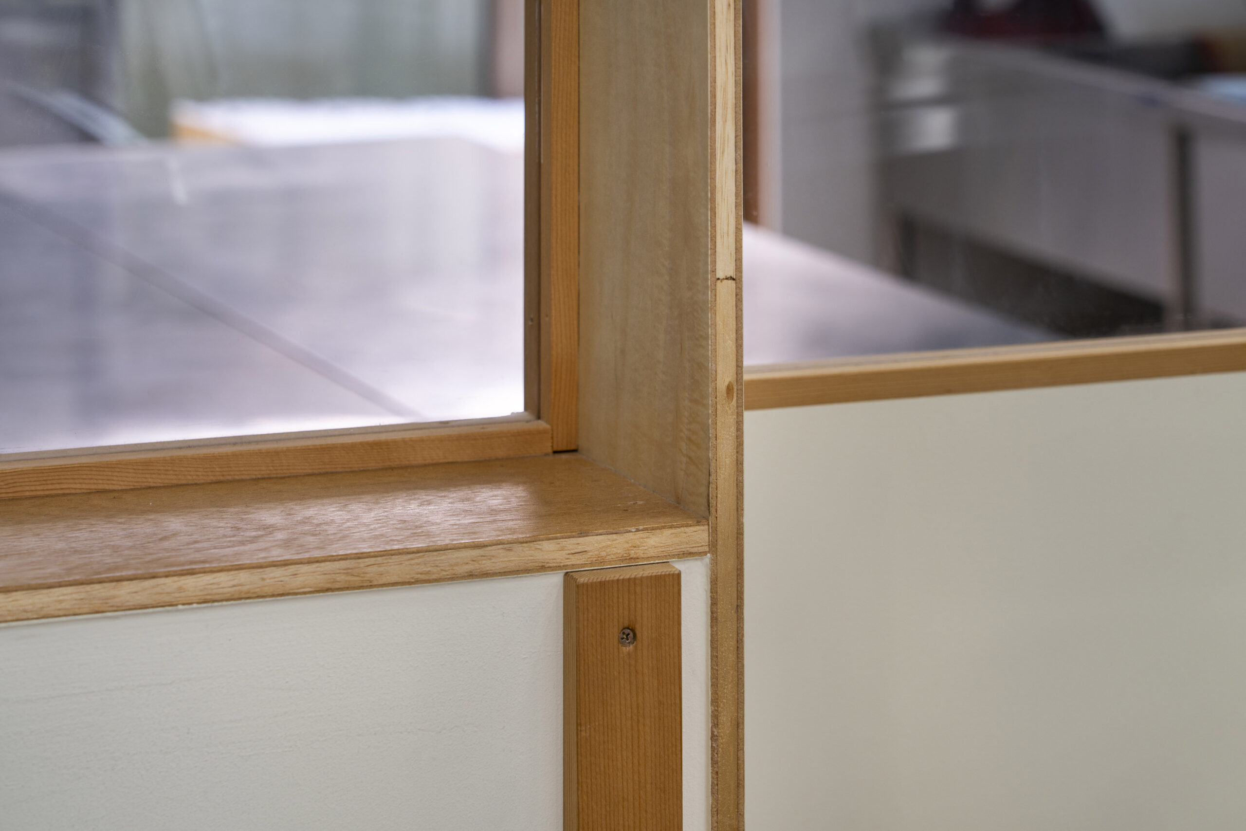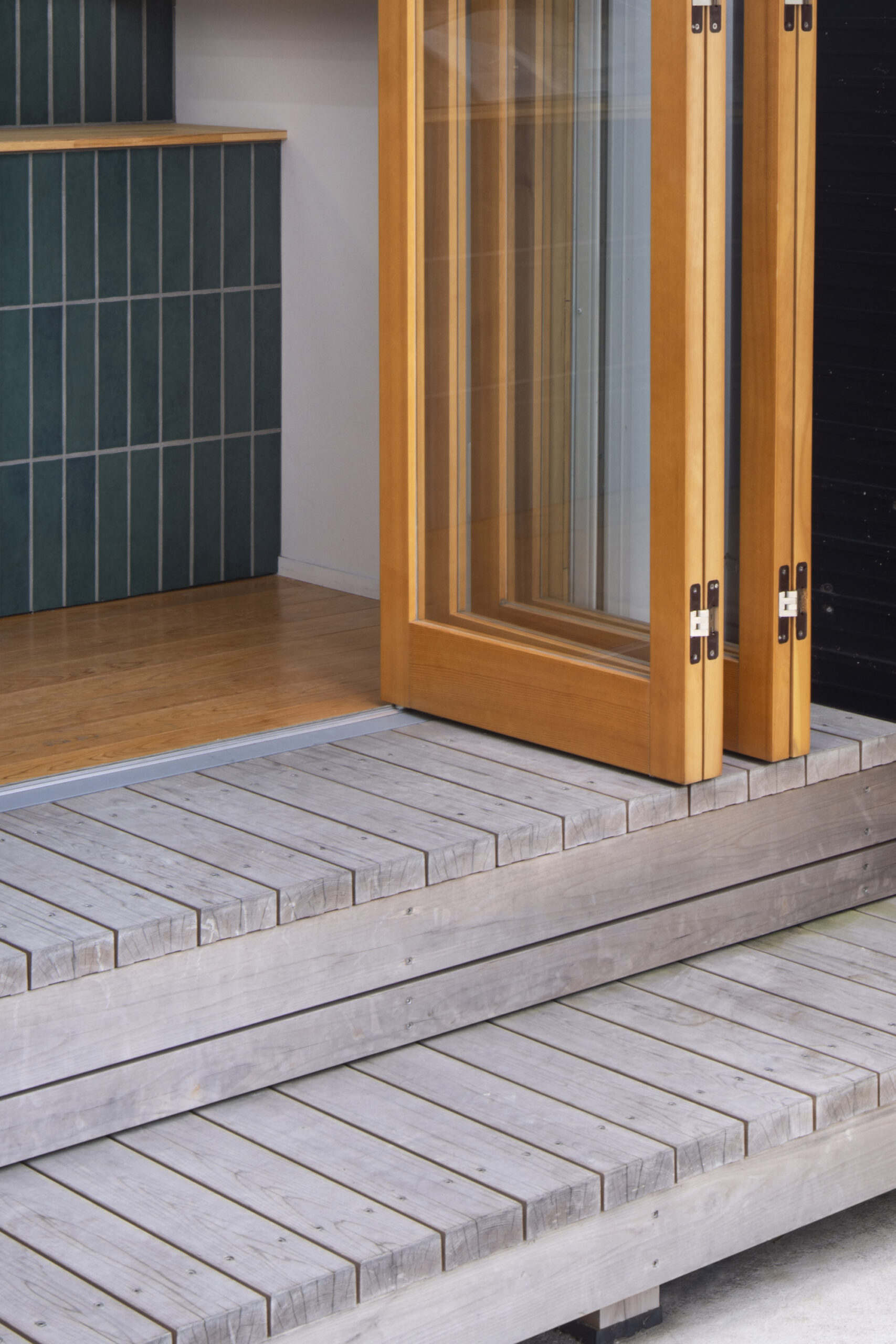 元々は、住宅の水回りで閉じていた場所を道路側に開き、大きな開口を持った店構えを作った。季節の良い時期は片開き戸と折れ戸とを開放することで、離れた場所からでもお店があることがわかるようにした。